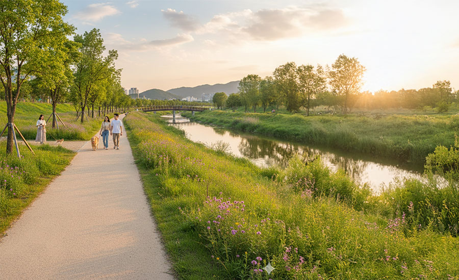 북한산에서 시작되는 고양시 대표 자연 하천 창릉천은 안전하고 쾌적하게 산책할 수 있는 자연 친화형 코스를 제공합니다.